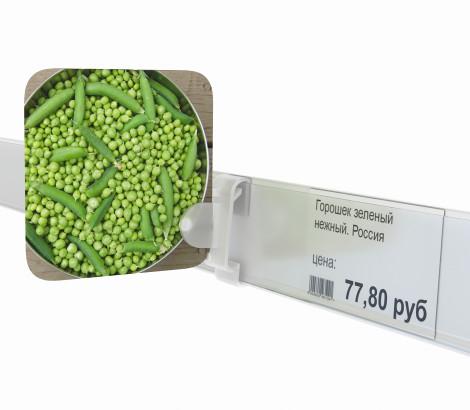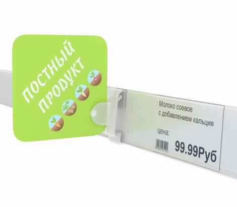 Клипса для крепления рекламных стопперов на полочный ценникодержатель высотой 26, 30 и 39 мм  и на край некоторых видов полок. Клипса используется с стопперами из ламинированного картона или тонкого пластика  до 0,8 мм. Вставка хорошо держится в клипсе благодаря штырьку на стоппере и  обеспечивает надежную фиксацию.