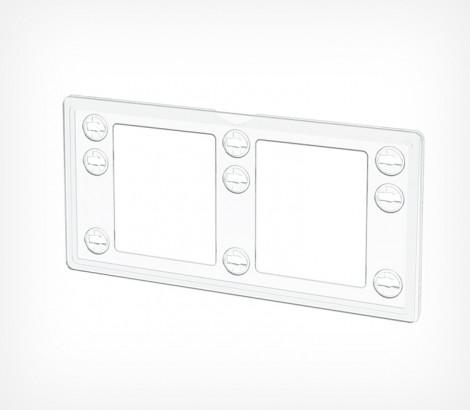 Универсальная рамка-ценникодержатель с девятью гнездами крепления рамки на разных уровнях относительно полки. Прорезь для рамки по широкой стороне рамки.