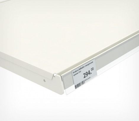 Изготовлен из ударопрочного пластика, крепится на передний край полки с помощью прозрачного двухстороннего скотча, надёжно фиксируется на любой ровной и гладкой поверхности, бумажные ценники вставляются между двумя частями изделия.