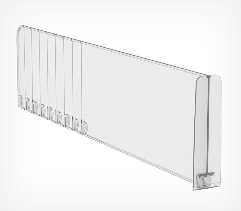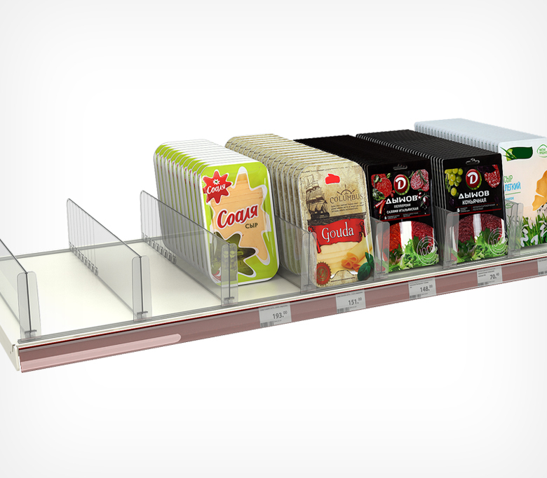 тип крепления: замок на Т-профиль. Особенности: используется для упаковки, например, с нарезками сыров, колбасных и мясных изделий, пачками с крупами, сухими завтраками, детским питанием, колготками, передний ограничитель удерживает товар от падения с полки, насечки по длине позволяют уменьшать размер изделия для разной глубины полок.