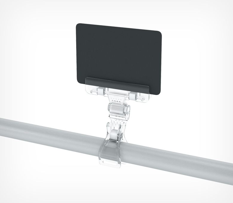 Держатель легко крепится на товар, край корзины или на трубчатое торговое оборудование (макс. диаметр 32 мм.) Ширина захвата - 80 мм., толщина вставки - до 6 мм. Может использоваться с грифельными табличками, бумажными, картонными, вставками из ПВХ и другими информационными носителями.