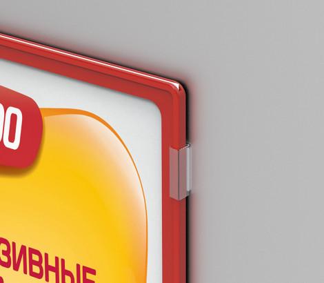 Клипса для крепления рамок к стене или другим ровным поверхностям под углом 0° или 90°. Клипса крепится к поверхности на вспененный скотч (нанесен на клипсу), размер полоски скотча - 40×9 мм. Для крепления рамки под углом 0° необходимо 3 или 4 клипсы. Количество клипс для крепления рамки под углом 90° зависит от формата рамки и качества поверхности.