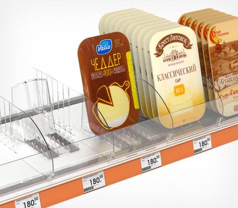 Применяется для организации на полке товаров крупного размера. Ограничитель предотвращает выпадание товара вперед, высота ограничителя 80 мм.